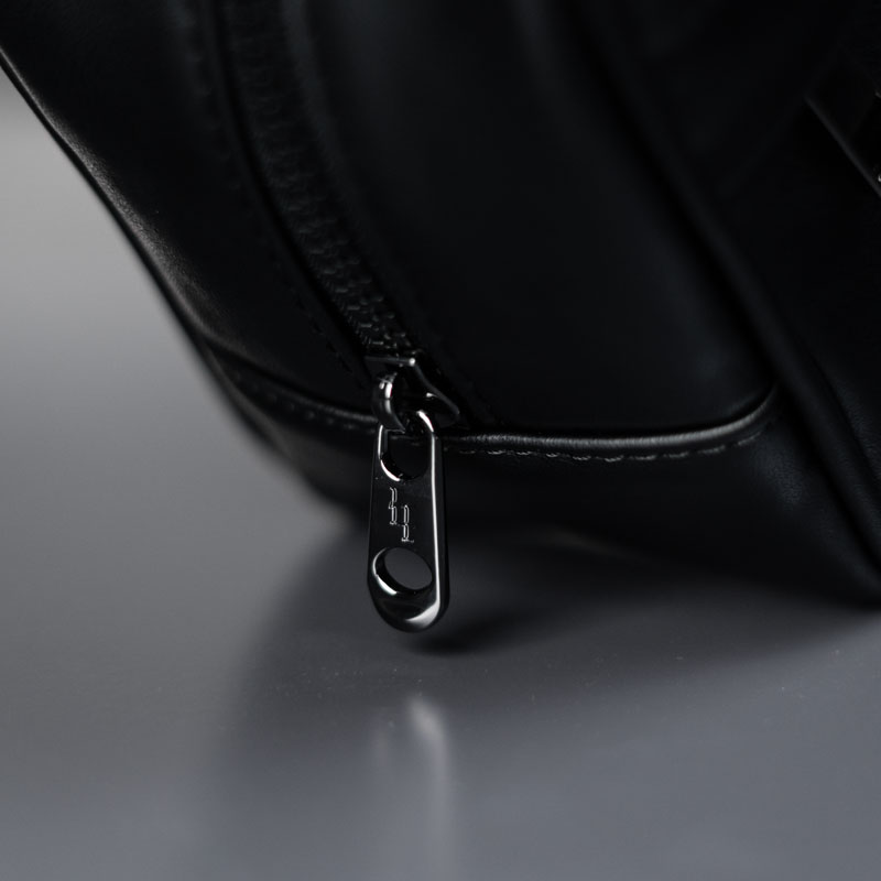 مصنوعة من الجلد الفاخر (vegan leather) بتفاصيل عملية، فيها سحّاب رئيسي من الأعلى، وجيبة داخلية للأغراض الأساسية، وجيبة خارجية مخفية بسحّاب لحفظ الأشياء الصغيرة بشكل أنيق.